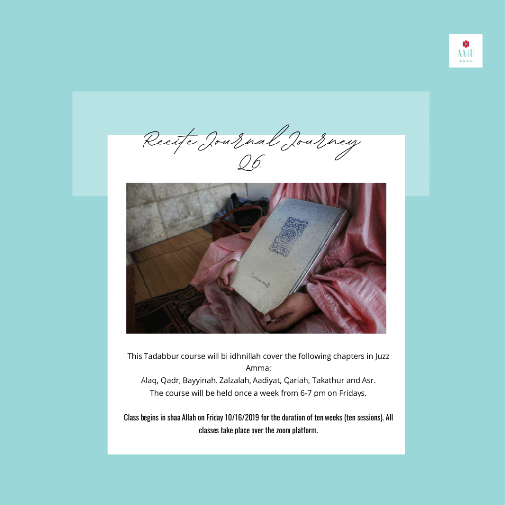We need to make the Qur’an our companion in this life so it becomes our companion in the Hereafter. Tadabbur is a beautiful way to connect with your Maker and with His words. Alhamdulillah we also offer self-study courses in Tadabbur on our learning portal and a new live class is coming up soon in shaa Allah in October, with sister Joi Faison Saleem. She took a well deserved break to bring into this world her baby and care for her family and she is now back teaching in shaa Allah. Click on this link to save your seat for the upcoming class. The tadabbur will be over the following suwar: Alaq, Qadr, Bayyinah, Zalzalah, Aadiyat, Qariah, Takathur and Asr.
